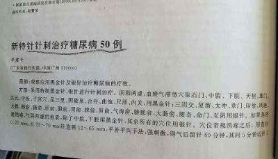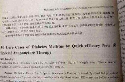 An international paper published on acupuncture treatment of 50 diabetic patients, 48 of whom were cured completely, 2 showed significant effect, and no recurrence in 15 years