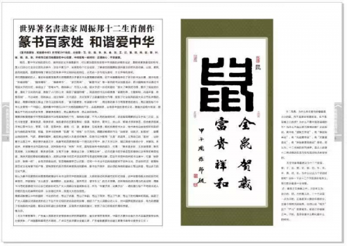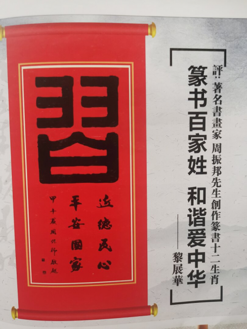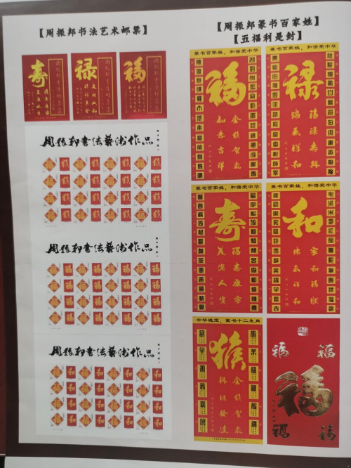 周振邦1981年创作,获中国知识权保护局注册成功登记的:不同寓意,不同命名,不同书体的《九福》书法作品是其所有作品的典范精品,具有很高的艺术价值和收藏价值。2015年世界华人书画家评选委员会在全球评选年度优秀书画家周振邦被评为2014-2015。年度优秀书画家荣誉称号并颁发证书。2012年应邀为广东省人民政府书刊封面题字《广东建设成就》和《文化嶺南》封面题字。2013年中国文史出版社,中央文史出版社发行:张海,周振邦,李铎《三人行》书法作品。2012-2013年广东省邮政局先后两次发行:《周振邦四十八个大字书法邮票集》。2017年广东省邮政局发行周振邦《篆书百家姓》,和谐愛中华,《篆书十二生肖》邮政明信片:(福)(禄)、(寿)、(和)、(猴)、(習)、(羊)。