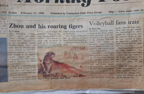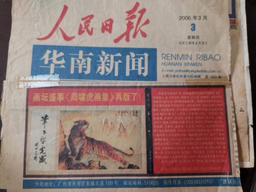 《信宜新闻》周啸虎—粤西信宜人的骄傲!纪念中国画虎大师周啸虎《一代虎圣》诞辰100周年!周啸虎,又名周瑷璋。出生于1898年,是宋代理学鼻祖,《爱莲说》作者周敦颐后䘱,书香世家。信宜市怀乡镇富多村书房坑人。中国著名画虎大师《一代虎圣》!1948,1949,1950年连续三年粤西信宜等地特大洪水,泛滥成灾,做成河堤崩塌,房屋倒塌,农田作物失收,农民处于水深火热困苦之中,周啸虎时在广东,他号召广书画家,义卖义捐义画震灾,他自己承诺只要有钱人,能出一斗谷的金錢购买稻谷帳灾,他就画一幅画给他,当时他一个人就用书画筹集了3000多斤稻谷款全部捐给了灾民,他的大爱慈善之心,几十年来,广为民间所流传!1998年在周啸虎诞辰100周年的时候,广东省美术家协会,广东省书法家协会联合在:广州盘福路周啸虎曾经学习和教学过的地方——广州盘福路《高剑父美术馆》为周啸虎举办了100多幅书画遗作展,中国书协主席沈鹏、中国美协主席刘大为、澳门书协、香港书协全国各省市书协、美协领导、书画大家500多人亲临现场参展,并有100多位书画大家题字纪念周啸虎诞辰100周年。《人民日报》《解放军》《南方日报》,《羊城晚报》《广州日报》《亞太经济时报》《星洲日报》国家,国际主流报刊和地方数十家报纸刋登报道过此消息,广东电视台信宜电视台等新闻媒体也多次报导过起消息。嶺南画派创始人高剑父的入门大弟子,中国画虎大师《一代虎圣》周啸虎又从新走进人民大众的视野。周啸虎粤西信宜人的骄傲!